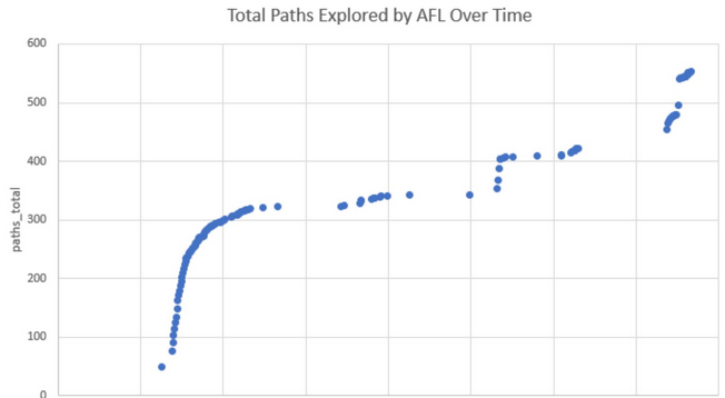 Once a student has AFL running correctly (e.g., following the instructions above, not forgetting the @@, etc.) and has seen AFL produce some new images (e.g., by inspecting the output directory from another shell terminal window), that student should feel confident allowing AFL to continue to run. It is very common for AFL to "plateau" or "get stuck" for a while and recover naturally.