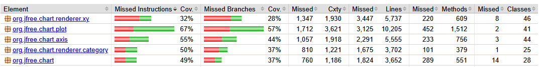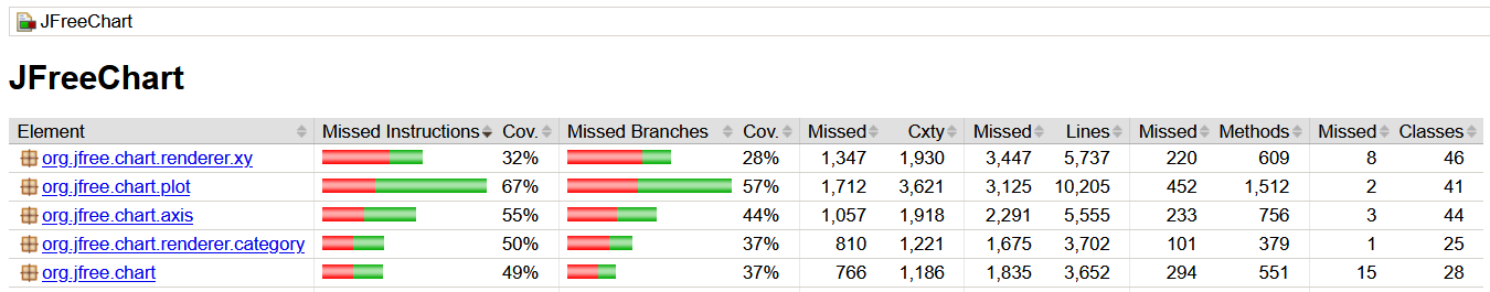 $ mvn test -Dmaven.test.failure.ignore=true [INFO] Scanning for projects... [INFO] [INFO] ------------------------< org.jfree:jfreechart >------------------------ [INFO] Building JFreeChart 1.5.6 [INFO] --------------------------------[ jar ]--------------------------------- [INFO] [INFO] --- jacoco-maven-plugin:0.8.12:prepare-agent (default) @ jfreechart --- [INFO] argLine set to -javaagent:/home/ubuntu/.m2/repository/org/jacoco/org.jacoco.agent/0.8.12/org.jacoco.agent-0.8.12-runtime.jar=destfile=/home/ubuntu/hw2/jfreechart-1.5.6/target/jacoco.exec [INFO] [INFO] --- maven-resources-plugin:3.3.1:resources (default-resources) @ jfreechart --- [INFO] Copying 45 resources from src/main/resources to target/classes [INFO] [INFO] --- maven-compiler-plugin:3.14.0:compile (default-compile) @ jfreechart --- [INFO] Nothing to compile - all classes are up to date. [INFO] [INFO] --- maven-resources-plugin:3.3.1:testResources (default-testResources) @ jfreechart --- [INFO] skip non existing resourceDirectory /home/ubuntu/hw2/jfreechart-1.5.6/src/test/resources [INFO] [INFO] --- maven-compiler-plugin:3.14.0:testCompile (default-testCompile) @ jfreechart --- [INFO] Recompiling the module because of changed source code. [INFO] Compiling 367 source files with javac [debug deprecation target 1.8] to target/test-classes [WARNING] bootstrap class path not set in conjunction with -source 8 [WARNING] source value 8 is obsolete and will be removed in a future release ... [WARNING] /home/ubuntu/hw2/jfreechart-1.5.6/src/test/java/org/jfree/chart/ErrorZeroTest.java:[856,61] equal(java.lang.Object,java.lang.Object) in org.jfree.chart.util.ObjectUtils has been deprecated ... [WARNING] /home/ubuntu/hw2/jfreechart-1.5.6/src/test/java/org/jfree/chart/RegressionZeroTest.java:[41,34] NW_RESIZE_CURSOR in java.awt.Frame has been deprecated ... [INFO] Results: [INFO] [ERROR] Failures: [ERROR] ErrorZeroTest.test001:34 Contract failed: equals-hashcode on objectList2 and objectList5 [ERROR] ErrorZeroTest.test002:85 Contract failed: compareTo-equals on stringBuffer33 and stringBuffer70 ... [ERROR] Tests run: 4752, Failures: 138, Errors: 0, Skipped: 0 [INFO] [ERROR] There are test failures. See /home/ubuntu/hw2/jfreechart-1.5.6/target/surefire-reports for the individual test results. See dump files (if any exist) [date].dump, [date]-jvmRun[N].dump and [date].dumpstream. [INFO] [INFO] --- jacoco-maven-plugin:0.8.12:report (report) @ jfreechart --- [INFO] Loading execution data file /home/ubuntu/hw2/jfreechart-1.5.6/target/jacoco.exec [INFO] Analyzed bundle 'JFreeChart' with 572 classes [INFO] ------------------------------------------------------------------------ [INFO] BUILD SUCCESS [INFO] ------------------------------------------------------------------------ [INFO] Total time: 28.953 s [INFO] Finished at: 2025-09-13T11:18:04Z [INFO] ------------------------------------------------------------------------Critically, note how the old Tests run: 2351 printed output from before we added in the new tool-generated tests has changed to Tests run: 4725. (Your numbers will likely be different because everyone will generate different randomly-created tests.) This new higher number represents the union of the developer-provided tests and the tool-generated tests. You can now zip the updated report to transfer for viewing. Note that if you extract the updated report to the same place where you extracted the original, it will overwrite the original and you won't be able to compare them. Instead, extract the updated report to a new location.